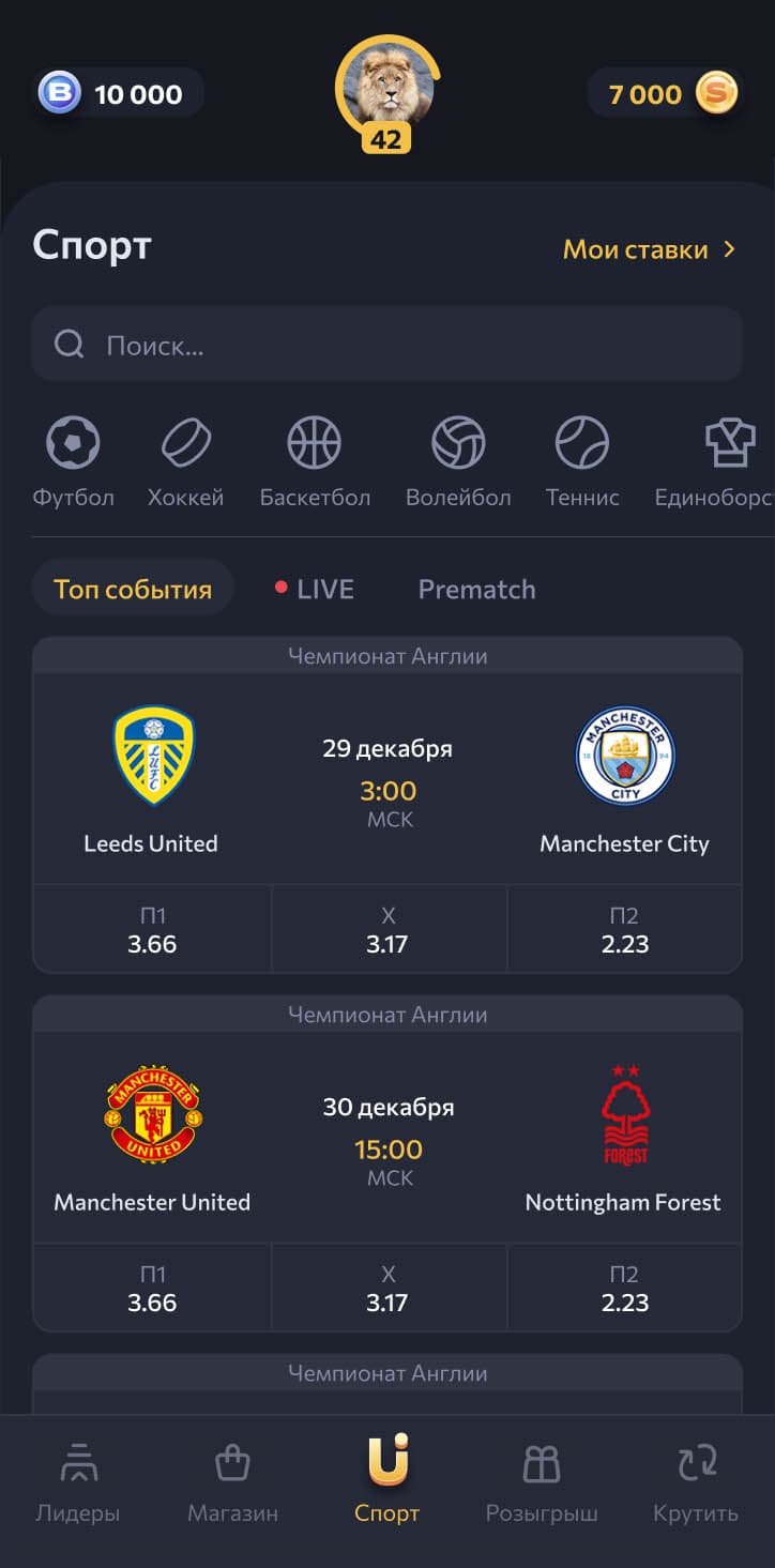 Ежедневно пользователям игры доступны сотни событий для ставок: от распространённых по всей планете футбольных и хоккейных матчей до менее популярных видов спорта, таких как настольный теннис.