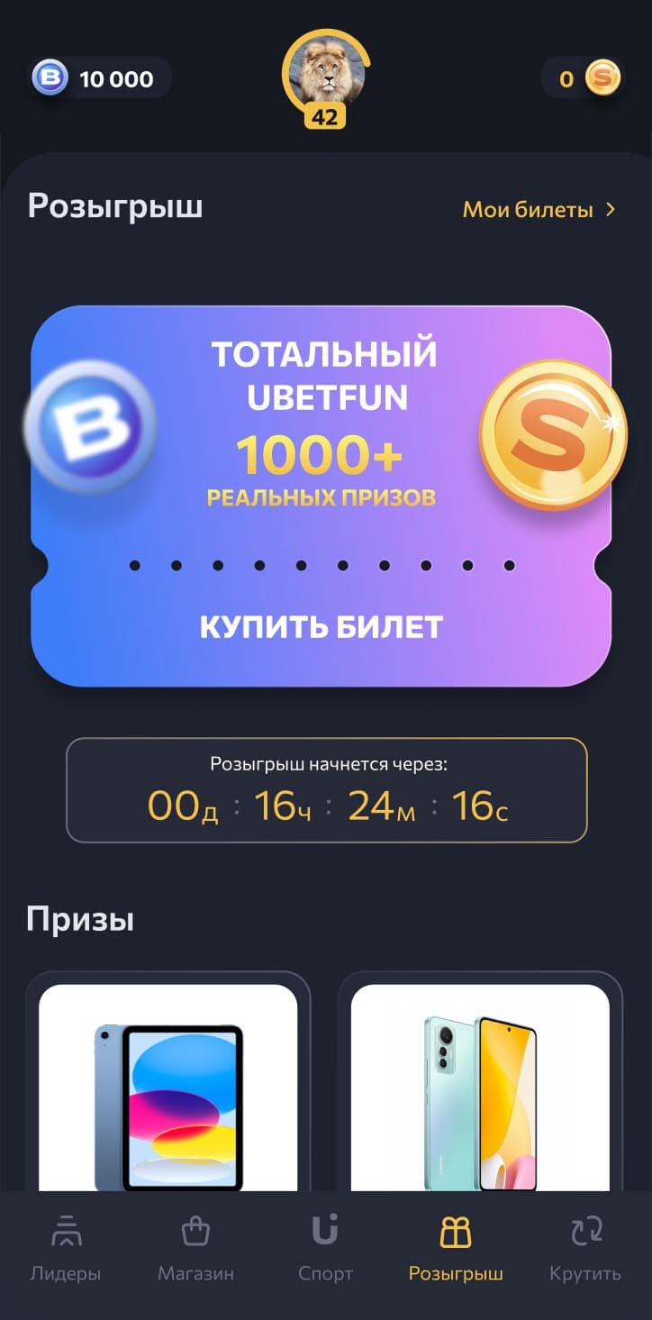 Покупай билеты с уникальным номером и участвуй в розыгрыше реальных призов. Если тебе повезет, ты сможешь получить свой приз абсолютно бесплатно!